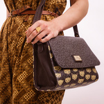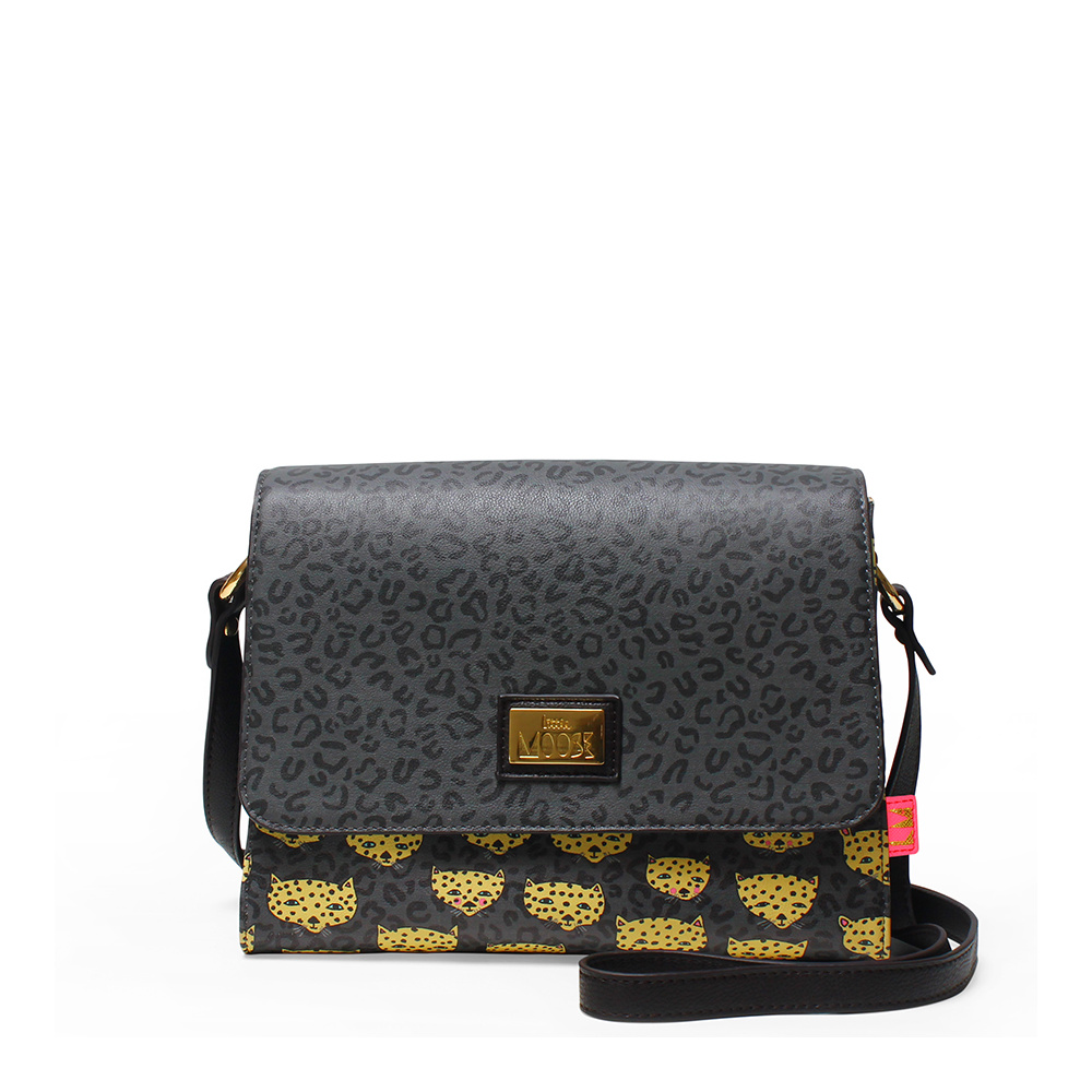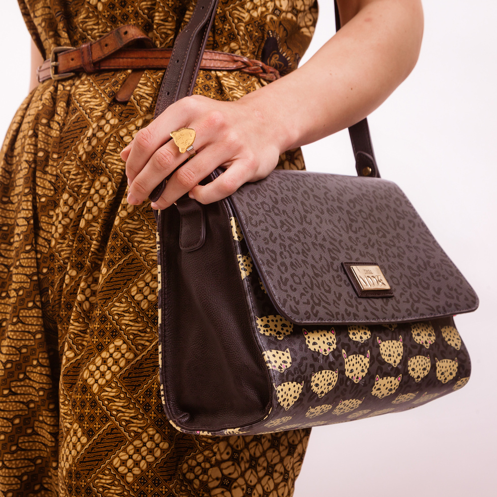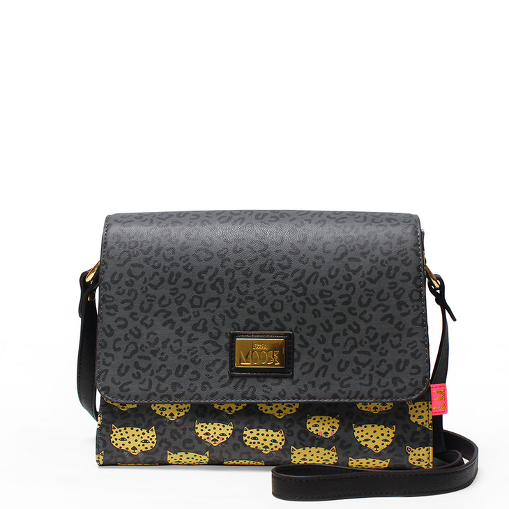 We've added dozens of quirky illustrated leopard heads to the classic leopard print pattern to create a unique shoulder bag. Fastened with a popper, the simple patterned flap hides a plethora of cute leopard faces. Take a closer look and you can see that some have even have charming pink cheeks.