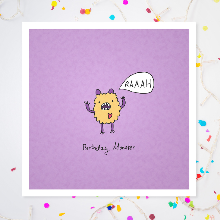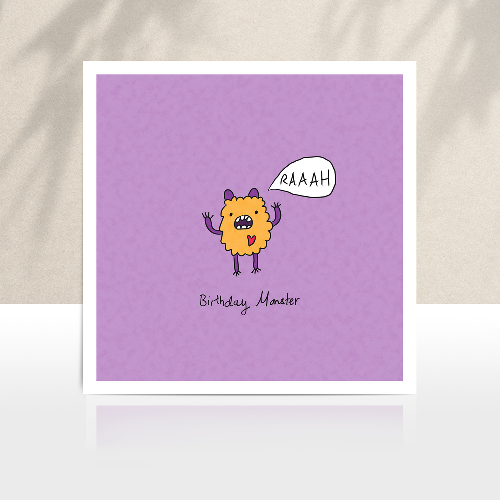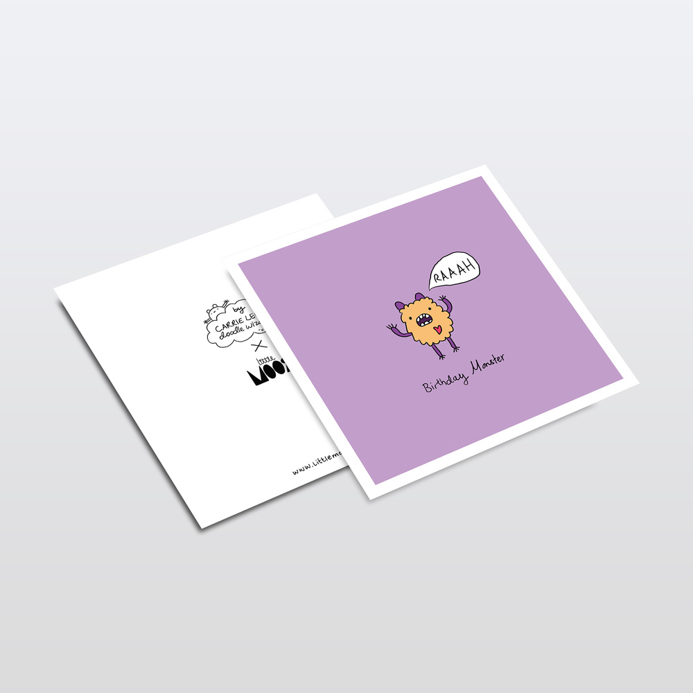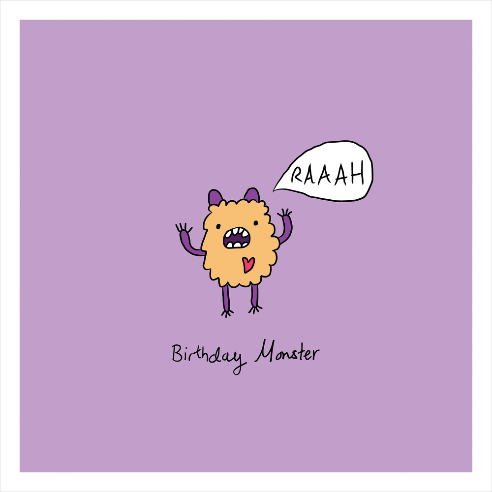 Raaah Monster birthday card illustrated by illustrator Carrie Lewis, Doodle Wizard. Fun colourful card to give to someone of any age to celebrate their birthday. Printed on to high quality matte card and with a blank inside so you can write our own message.