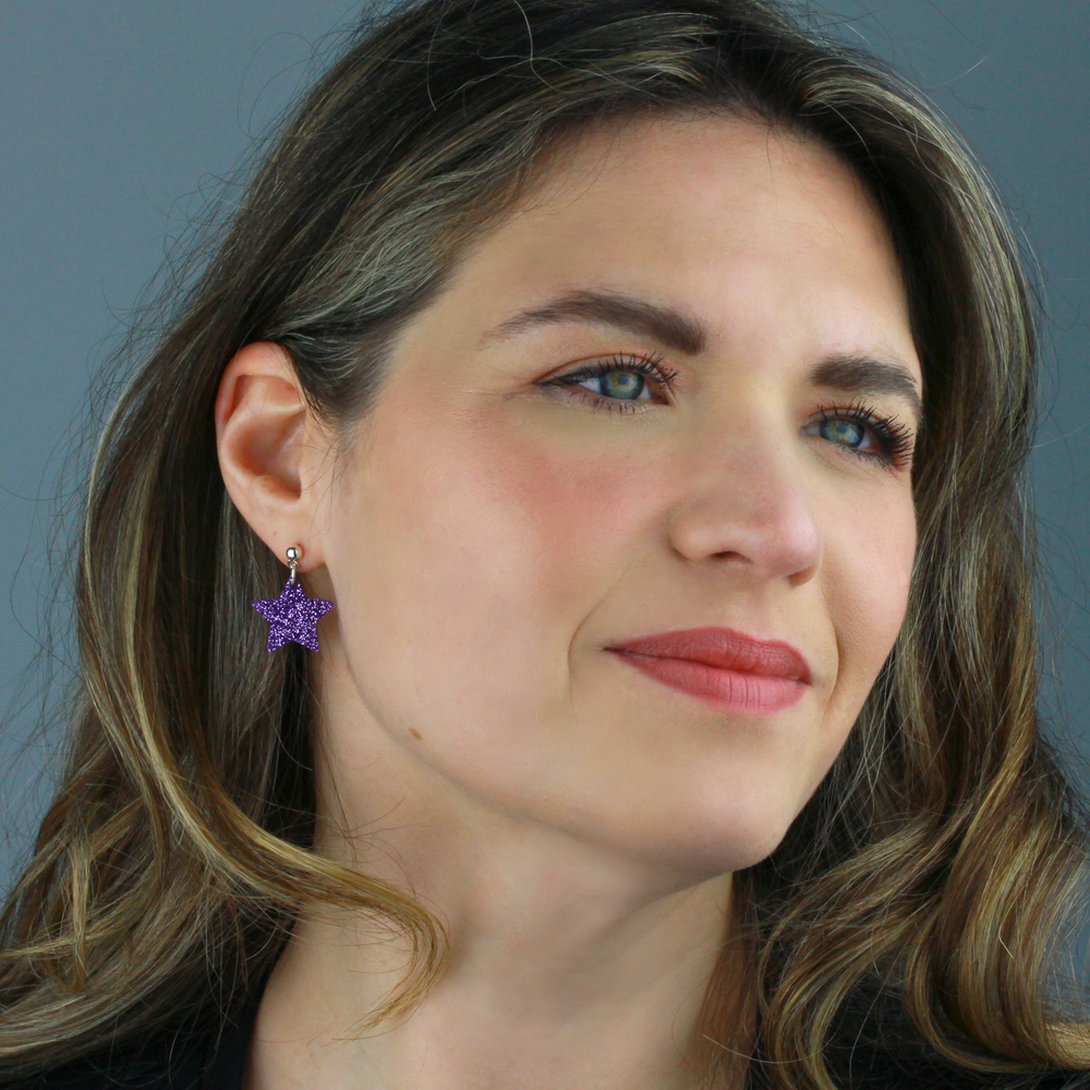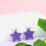 These punchy lilac star studs are a glittery delight. Handmade in our Sussex studio, these stars will shine brightly on every occasion. They sit beneath silver plated drop studs.