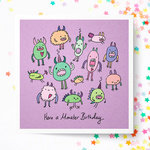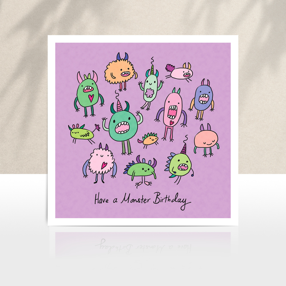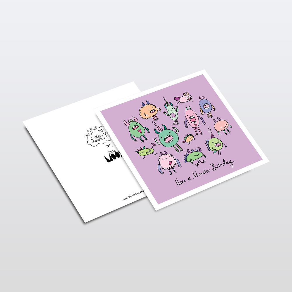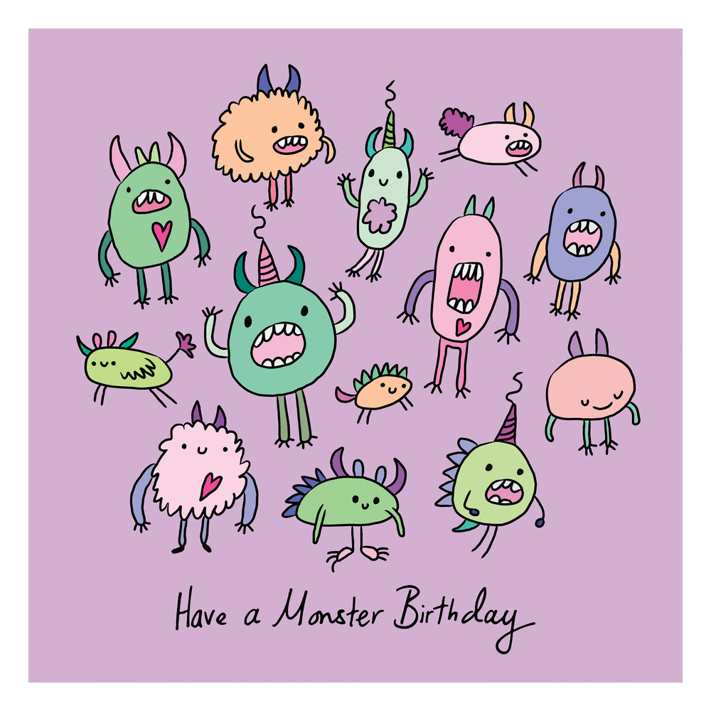 Fun lilac coloured card with colourful monsters illustrated by artist Carrie Lewis, Doodle Wizard. Printed on to high quality matte card and with a blank inside to write your own message. Perfect for wishing someone the happiest of birthdays old or young!