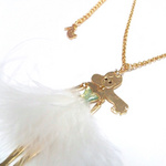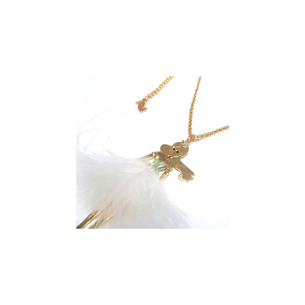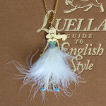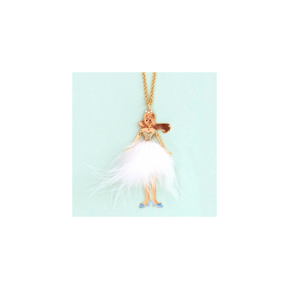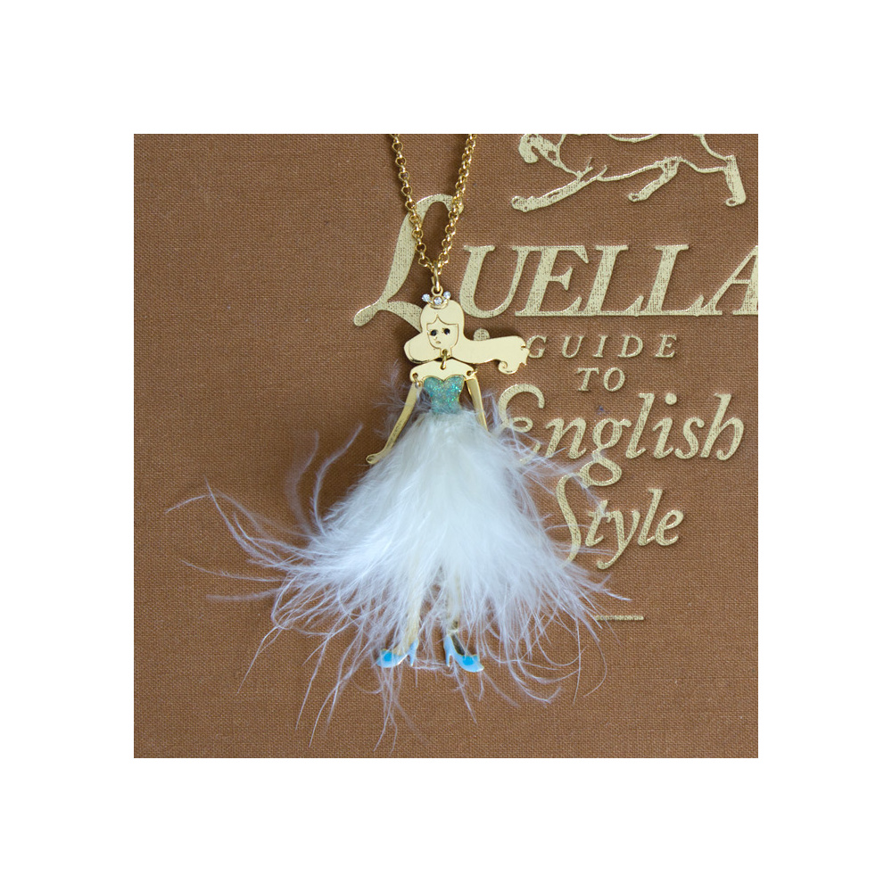 The golden Cinderella herself has crystal eyes and a dainty white fine feather dress, with pretty blue shoes. A gold plated shoe charm hangs from the chain.