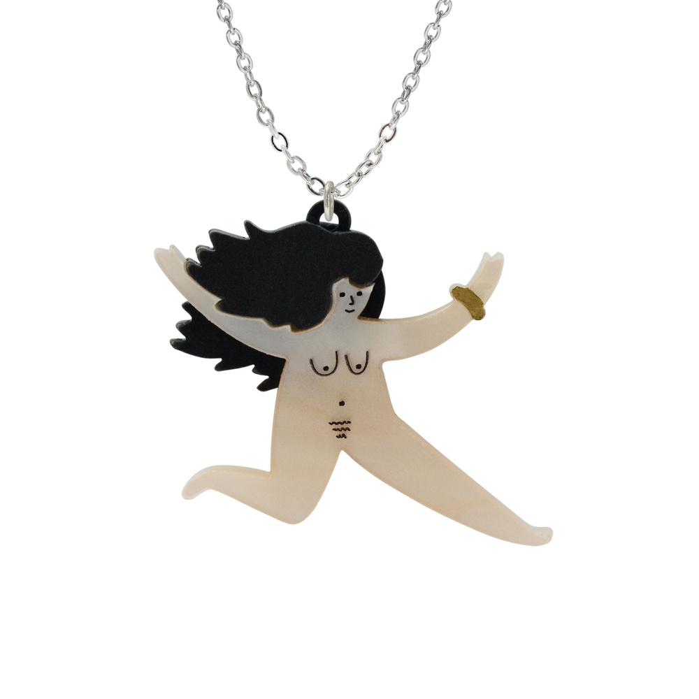 Jump for joy with this playful laser cut necklace. Featuring a lively lady with flowing, marbled black hair and hand inked detail. A perfect, playful necklace for the free spirits among us. Handmade in England, with love and care, from layers of gorgeous acrylic.