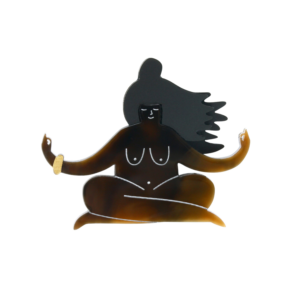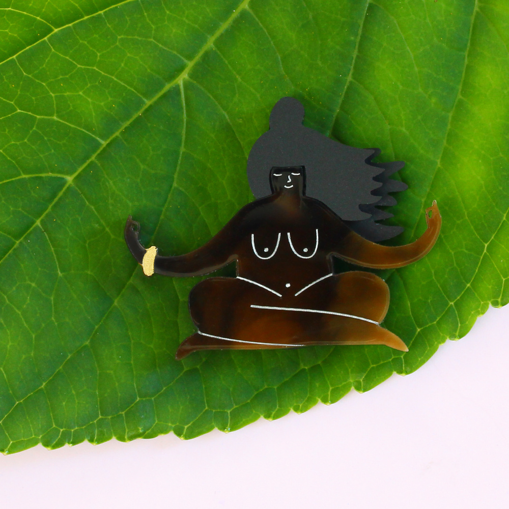 Get to grips with your inner Zen goddess with our quirky yoga brooch. What more is there to say, shes partaking in a spot of nudie yoga. Each brooch is lovingly assembled in our Sussex studio from pieces of marvelous marbled laser cut acrylic before being given a brush of gold and silver ink.