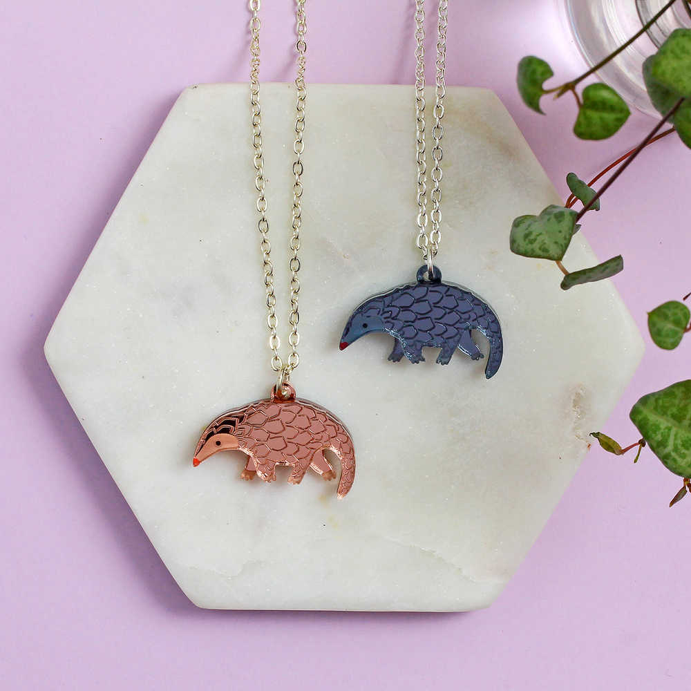 P...p...p...pick up a Pangolin and roll out of the door with a smile. Our Pangolin charm necklace is handmade in England from laser cut and etched mirrored grey perspex, and hand finished with white ink to make its little face stand out.