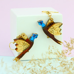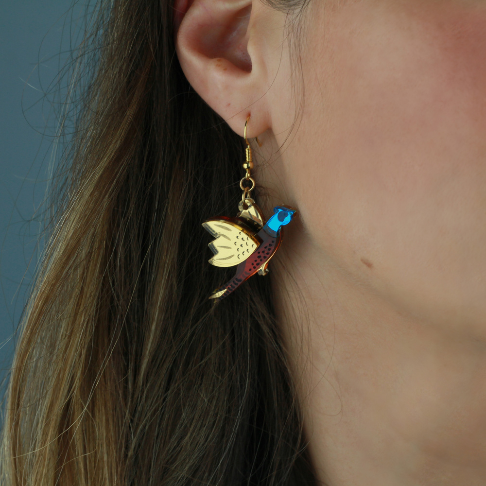 Our pheasant earrings are inspired by a lovely male pheasant who has visited us regularly over the past few years, bringing his bevvy of lucky ladies with him each morning. Our flying pheasant earrings are handmade in England from intricately detailed laser cut acrylic, each pheasant has etched mirrored gold wings and a tortoiseshell body, finished off with the recognisable mirrored blue head. Each pheasant is carefully hand inked to bring out the fine details.