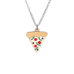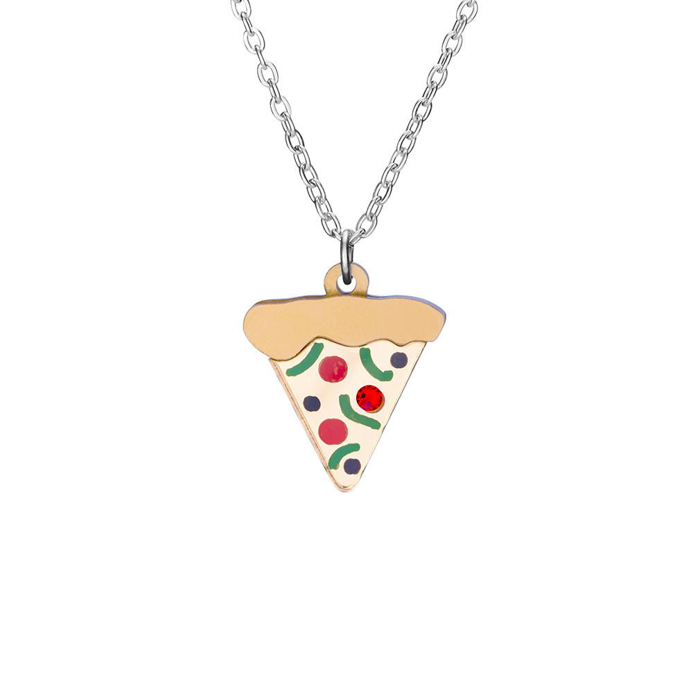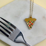 Our mini pizza slice necklace is handmade from pieces of laser cut perspex. We hand finish each necklace with coloured toppings and a red pepperoni crystal. Mmm, tasty.