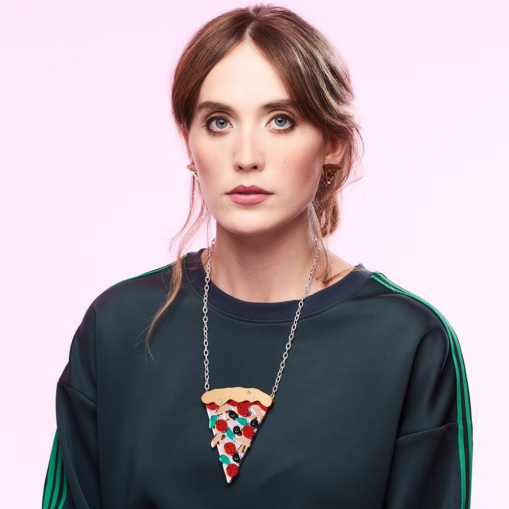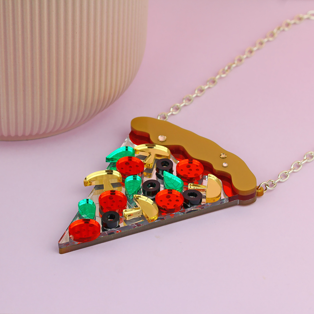 Just like a good pizza, a lot of love goes into each and every one of our statement pizza necklaces. Each slice is handmade from layers of gold and silver laser cut perspex, before being carefully topped with colourful olives, pepperoni, mushrooms and basil leaves. A trio of glistening crystals finish of this feast.