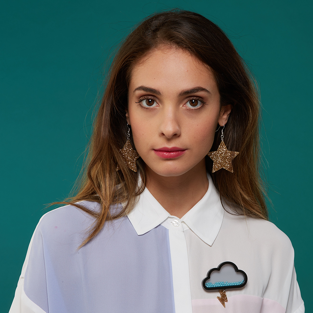 Clever layers of laser cut perspex allow our cloud brooch to be filled with little blue raindrops that move about when you do. Give this quirky brooch a shake and you might not be able to stop! Finished off with a glamorous strike of gold glitter lightning.