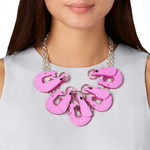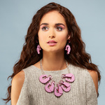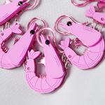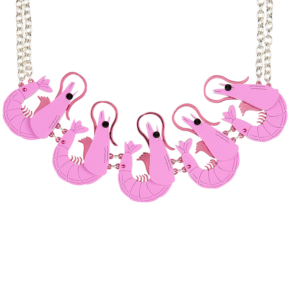 Our statement Prawn Collar Necklace is carefully handmade from layers of pastel pink and mirrored pink laser cut acrylic. This wonderful underwater gem is full of fun and movement (and sparkles). Finished off with big black crystals for eyes and a little pink crystal for some extra bling, our Prawn Collar necklace is a great way to liven up any outfit, both with colour and personality.