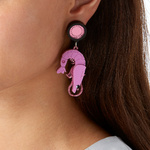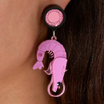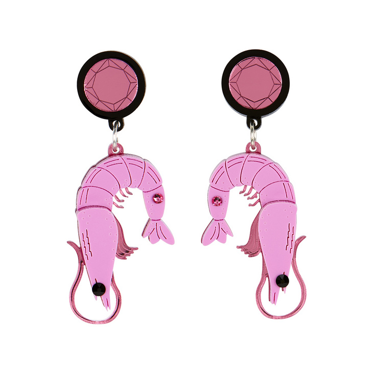 You might not think a prawns natural habitat is in the lustrous locks of a fashionable female, but our Prawn earrings might make you reconsider. This pair of cheeky prawns like nothing more than to feel the breeze on their (shelly) faces as they swing happily from your ears. Our prawn earrings are handmade from pink laser cut perspex and have lots of etched detail - glistening mirrored pinks and a pair of crystals add a sense of playful bling.