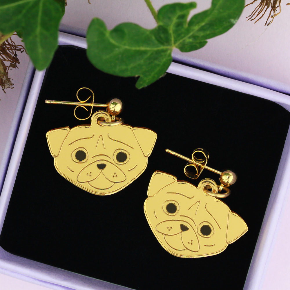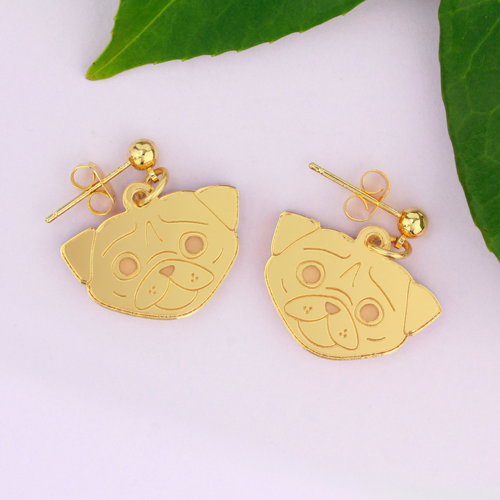 Keep on puggin', if that isn't in the big lexicon of phrases it certainly should be. Celebrate the pugs in your life with our playful pug earrings. Our original illustration, lovingly etched onto mirrored gold acrylic. A perfect poochy pair.