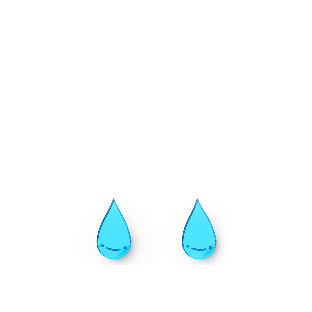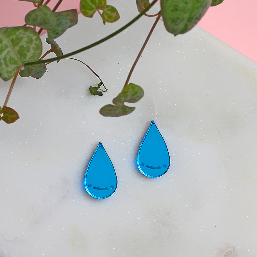 These happy little raindrop earrings will brighten up your day. Each raindrop is made from lasercut mirrored blue perspex and has a smiling face design. These earrings are a part of our Raincloud collection.
