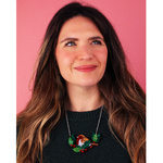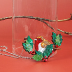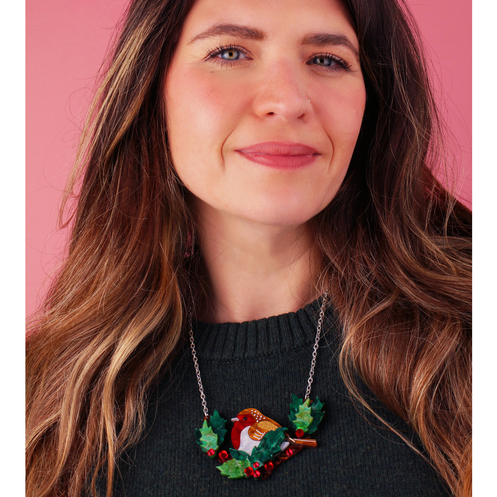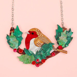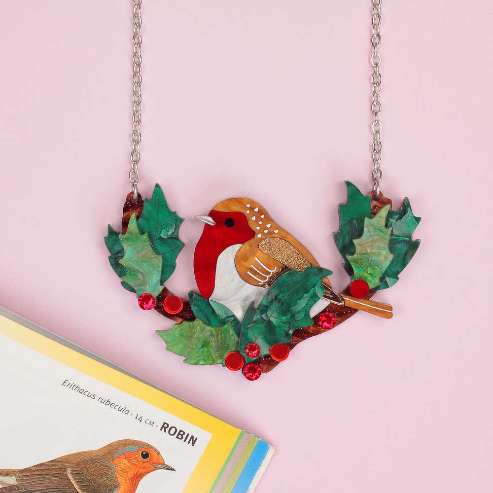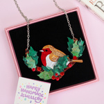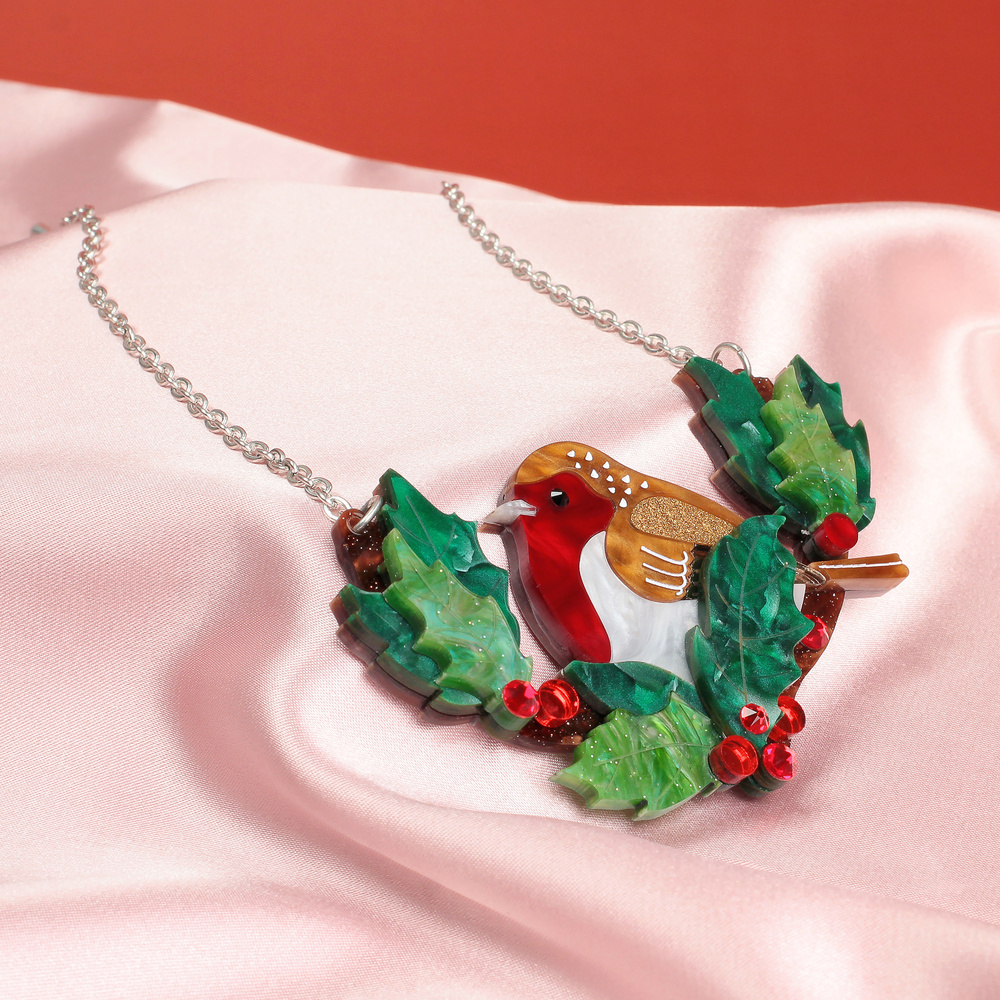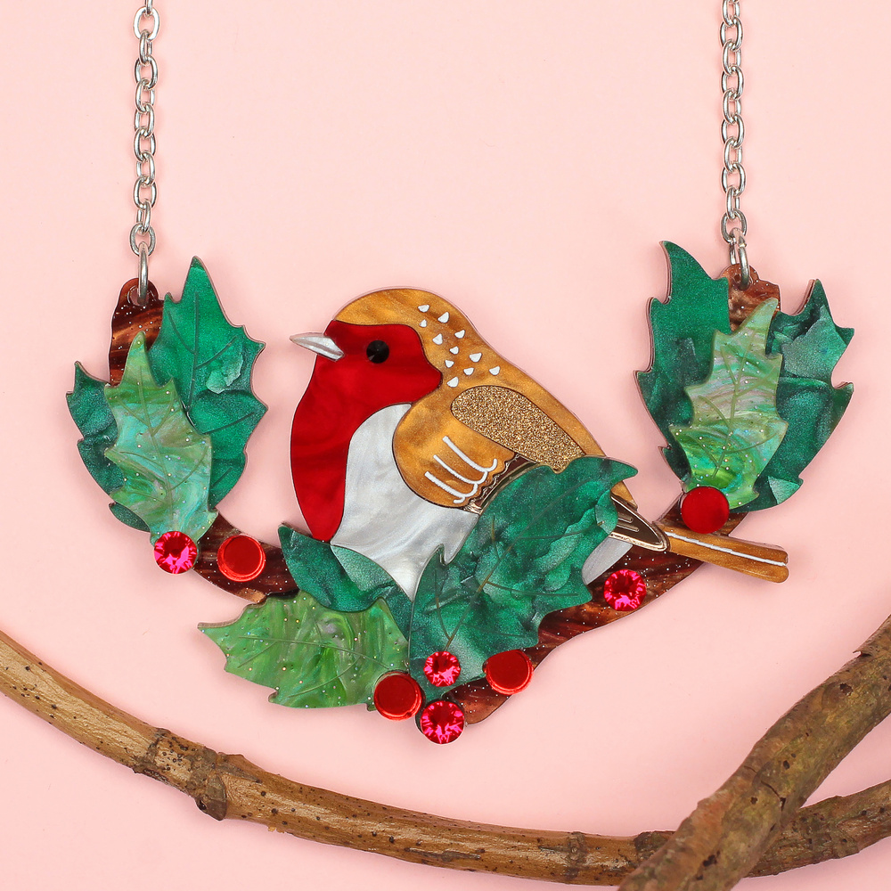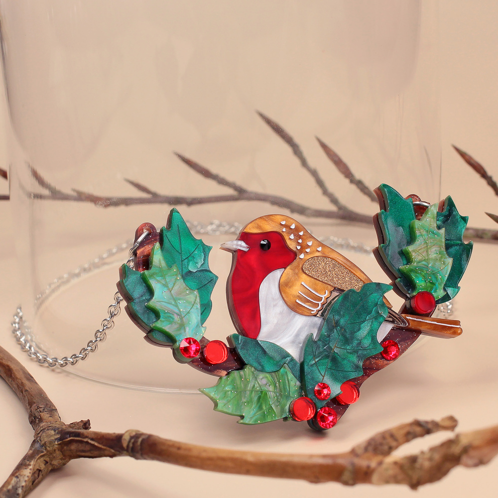 Our gorgeous robin necklace is handmade in our Sussex studio from a mix of luxury marbled, mirrored and glittered acrylics. As you'd expect, the striking feature is the marbled red breast. Our robin is nestled amongst fresh green holly leaves, with glistening red crystal berries scattered along its branch.