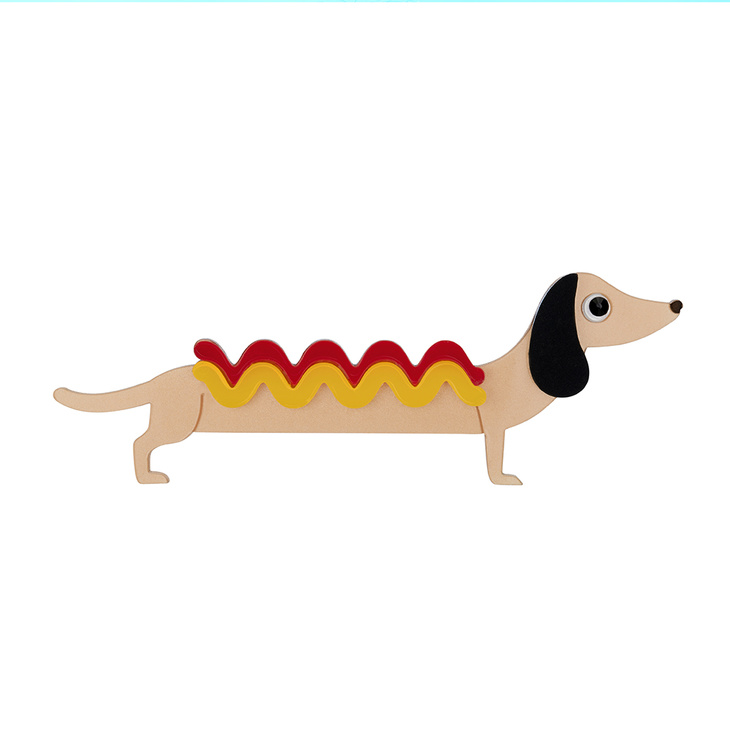 This fun brooch is handmade from a lovely metallic gold laser cut perspex and features a streak of yellow mustard and red ketchup, hand inked detail and a crystal eye.