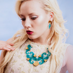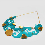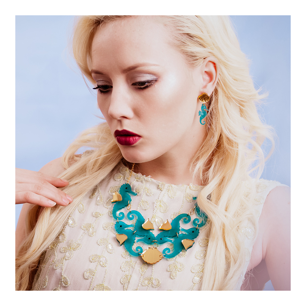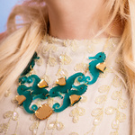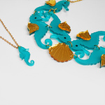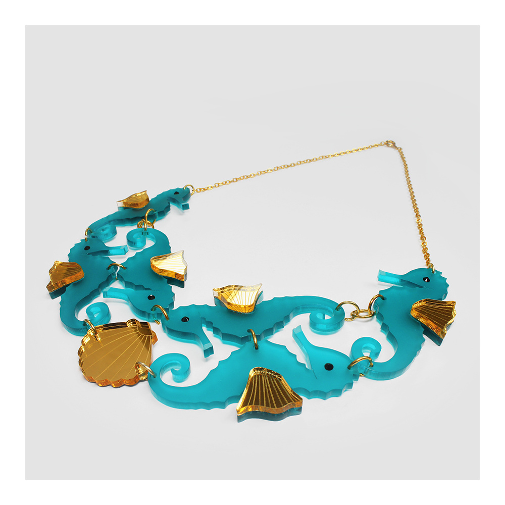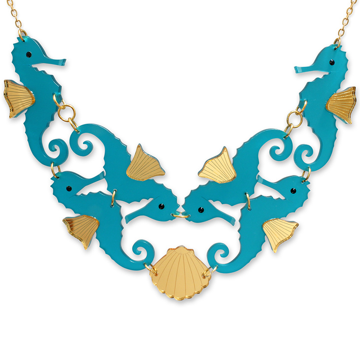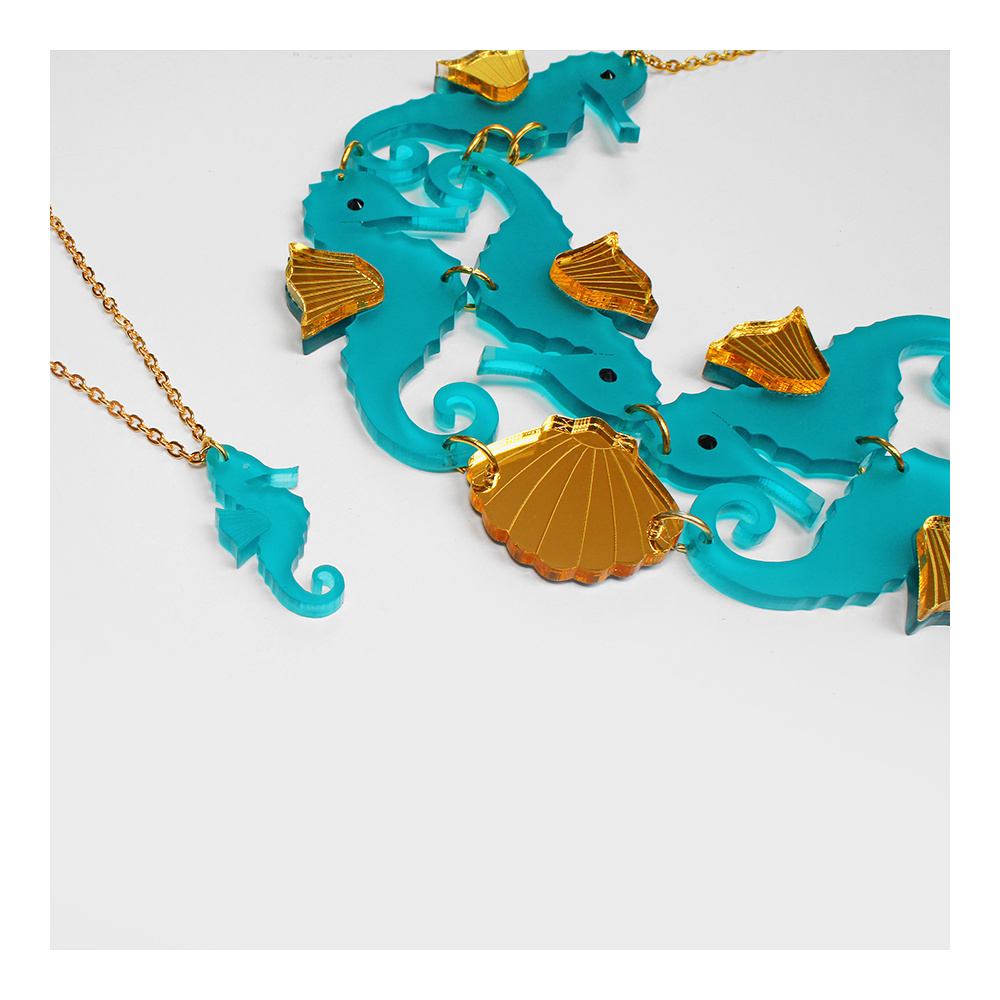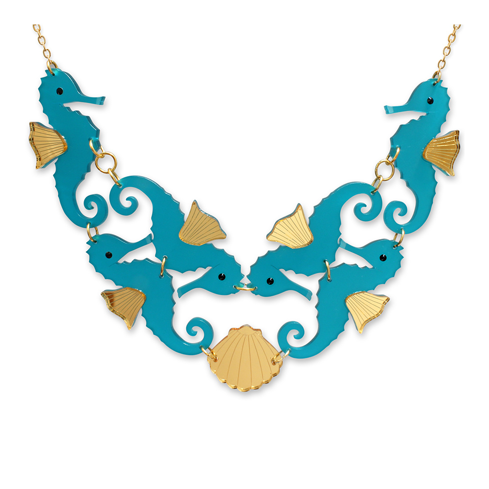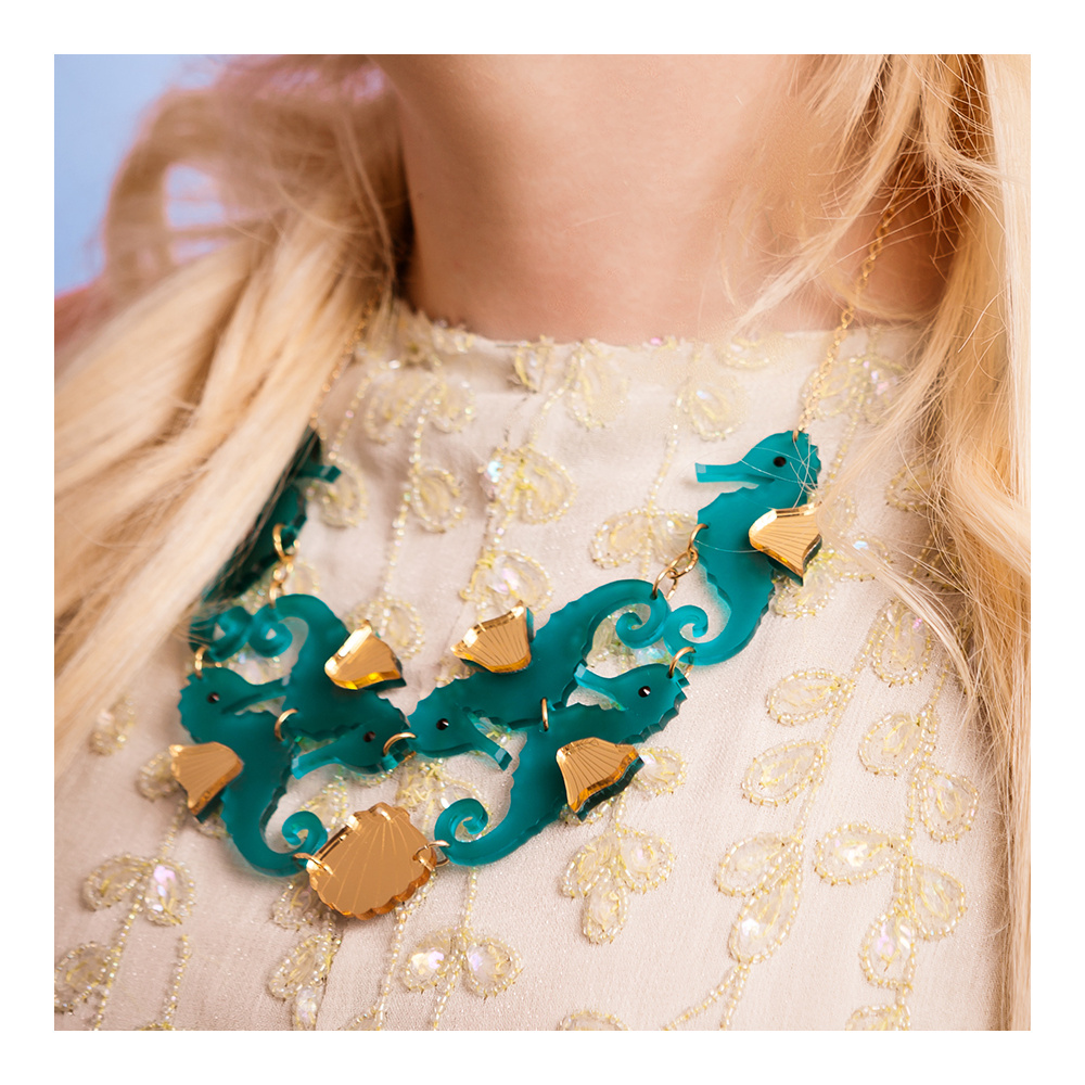 Transform yourself into a queen of the sea with our incredible Seahorse collar necklace. Carefully created from 6 charming seahorses, each with a black crystal eye and shimmering mirrored gold fin, this necklace is a real statement piece. Each seahorse has lovely etched detail and is made from an ethereal frosted green acrylic which looks just like 'sea glass'. At the centre of this magnificent piece is a large mirrored gold shell.