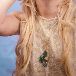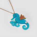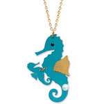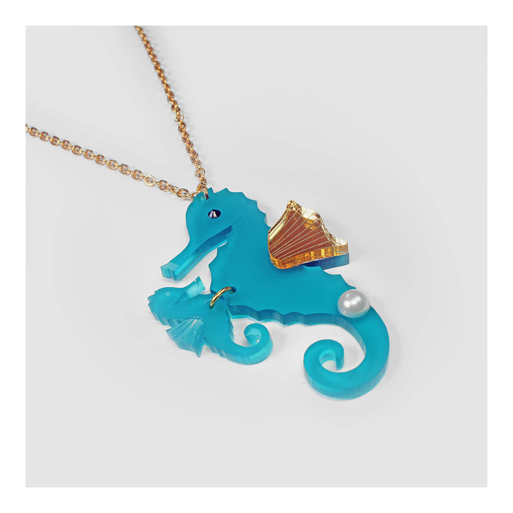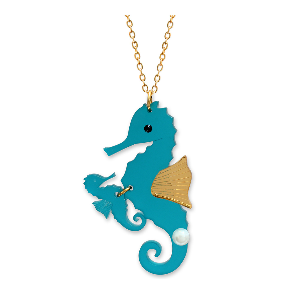 Our proud papa Seahorse is keeping a close eye on his little baby. This elegant necklace is made from frosted teal acrylic, which has a semi transparent sea glass appearance, adding to the underwater vibe. The larger seahorse has etched detailing, a black crystal eye, mirrored gold fin and shimmering pearl charm.