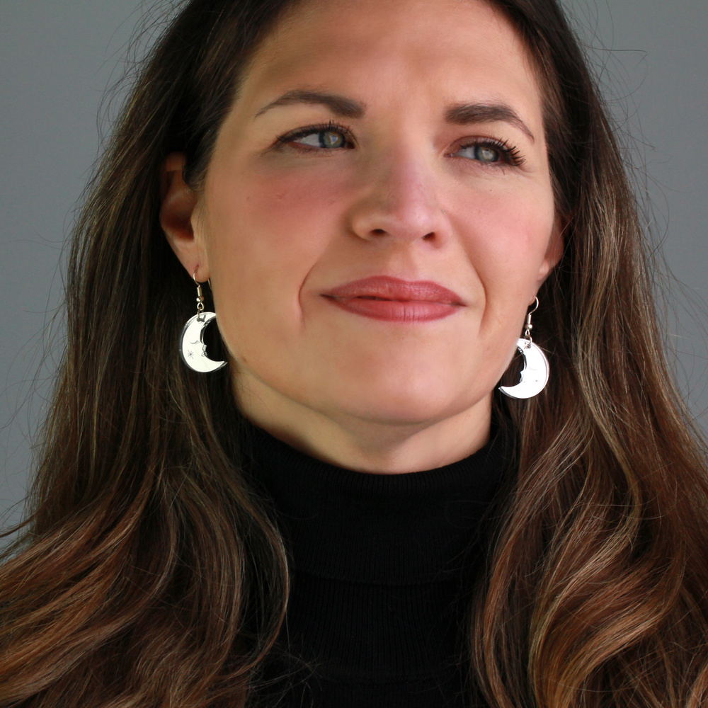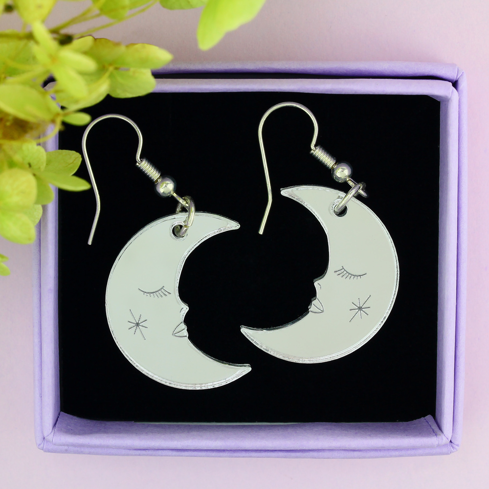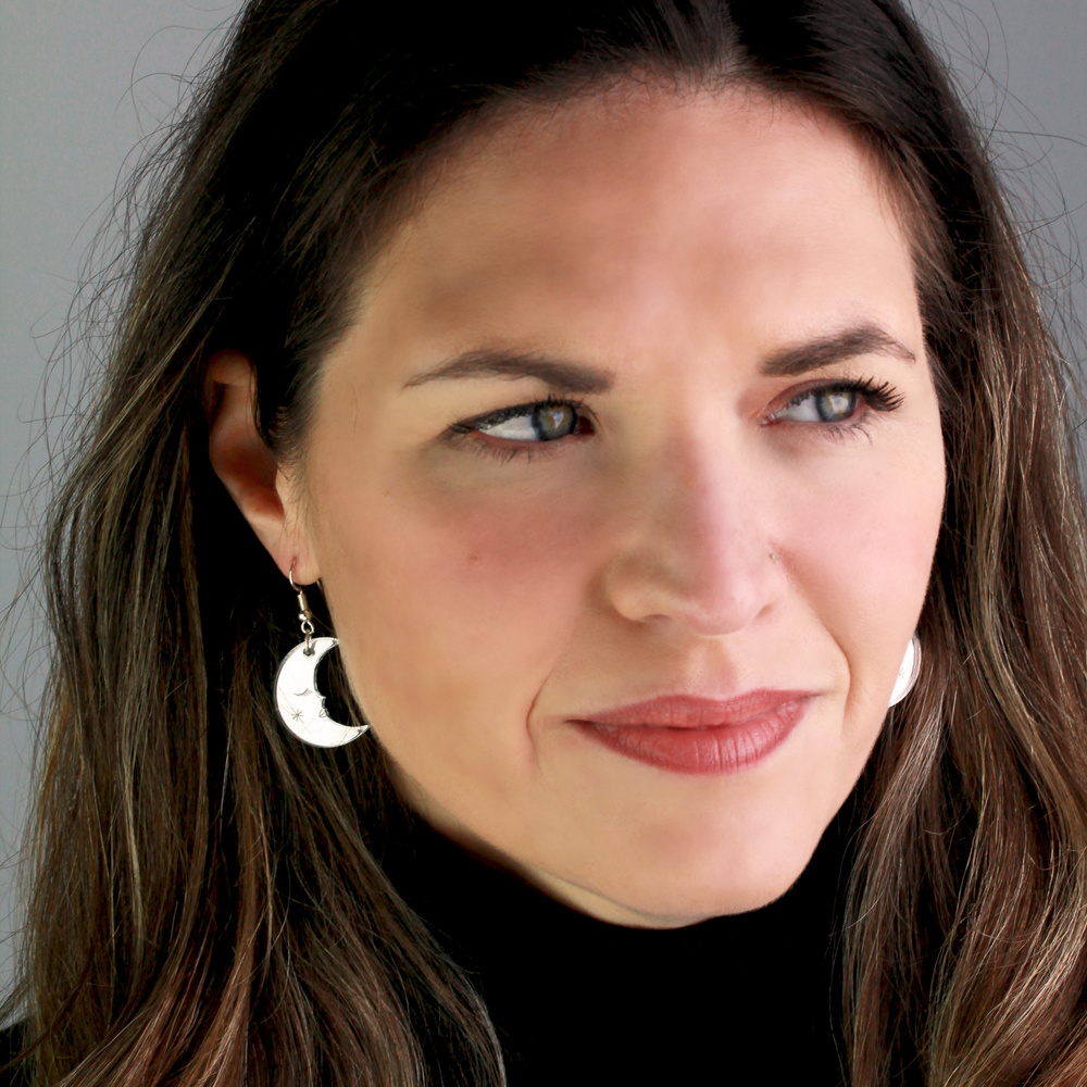 Our simple, easy to wear silver moon earrings are etched with a celestial face and hang from hypoallergenic stainless steel earring hooks. Dreamy.
