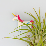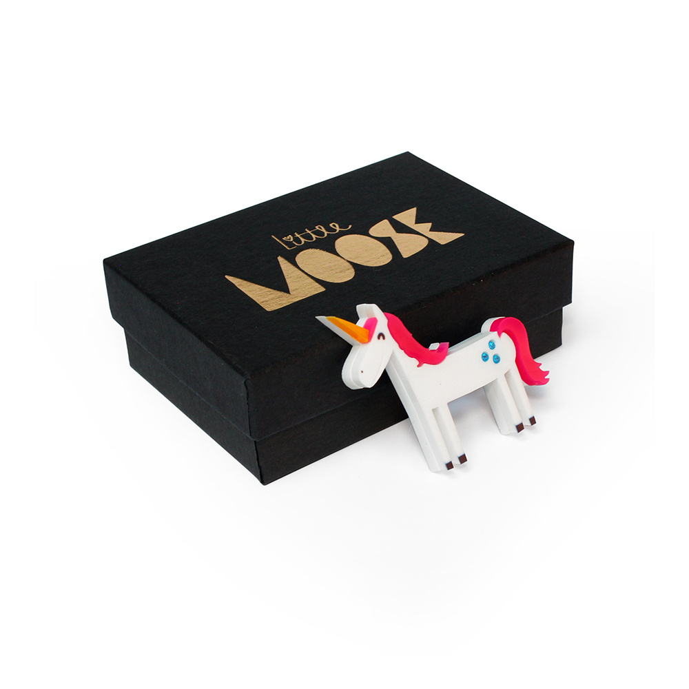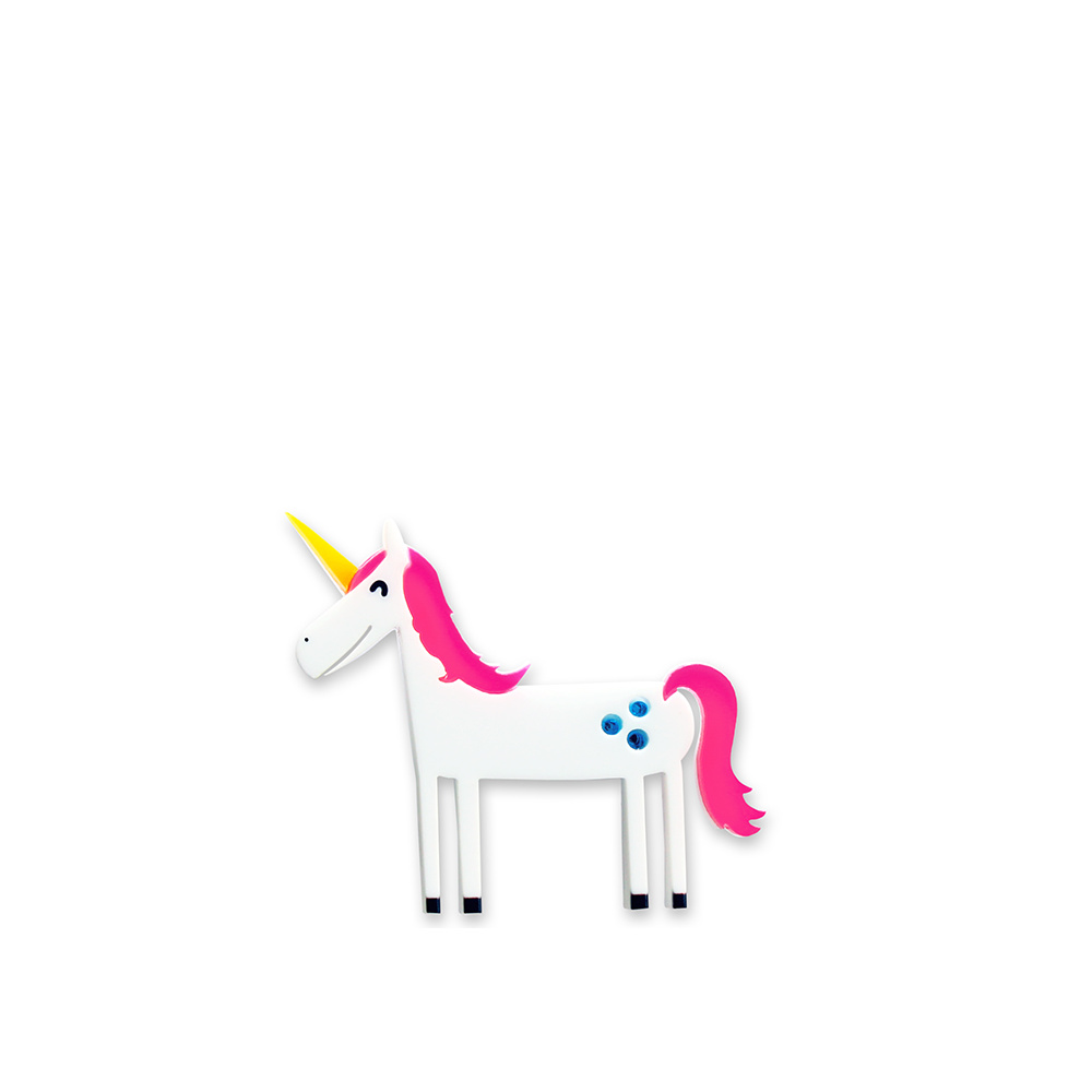 Give yourself a mythical treat with our handmade Space Unicorn brooch. This happy unicorn is made from layers of lasercut perspex and has three bright mirrored blue spots on his back. This is a great accessory for fun loving fashionistas.