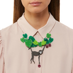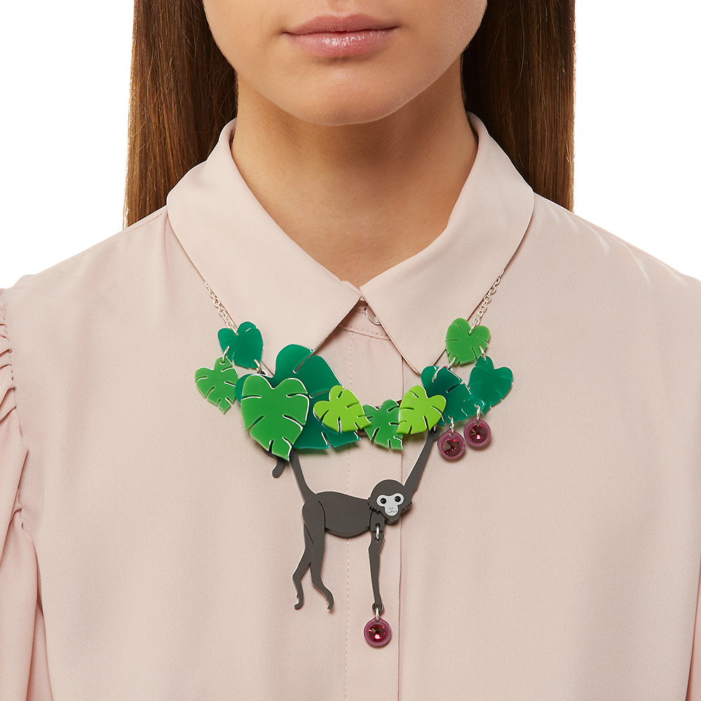 This striking necklace is carefully handmade from dozens of pieces of laser cut perspex. The spider monkey clutches a beautiful fig in one hand, which swings below its body. Gorgeous greens, perfect purples and earthy browns form a lovely palette and create a necklace that is sure to turn heads.