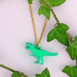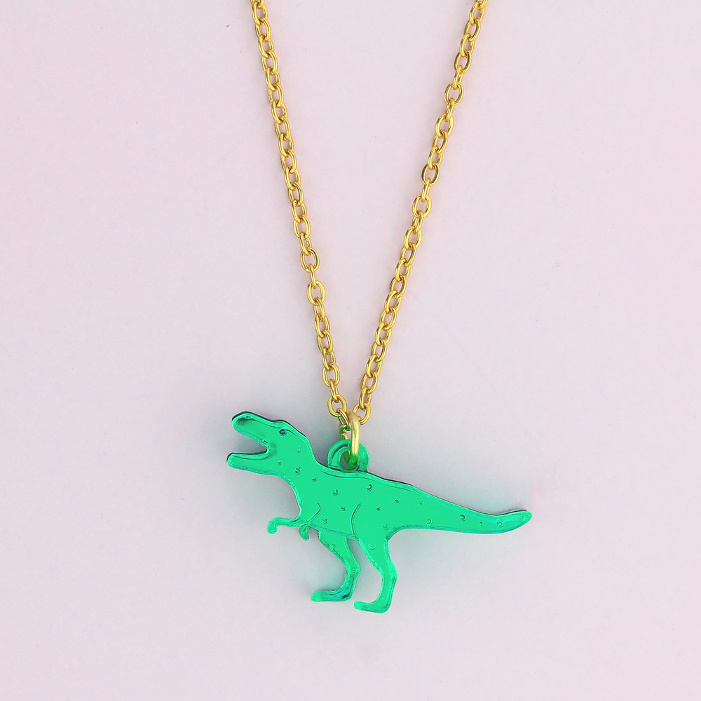 Our Tyrannosaurus Rex is more like a Tremendosaurus Rex in our opinion. This fierce little fellow is a gnarly, snarly T-Rex charm necklace made from 2 layers of etched, mirrored green acrylic. Available on an adjustable gold plated chain.