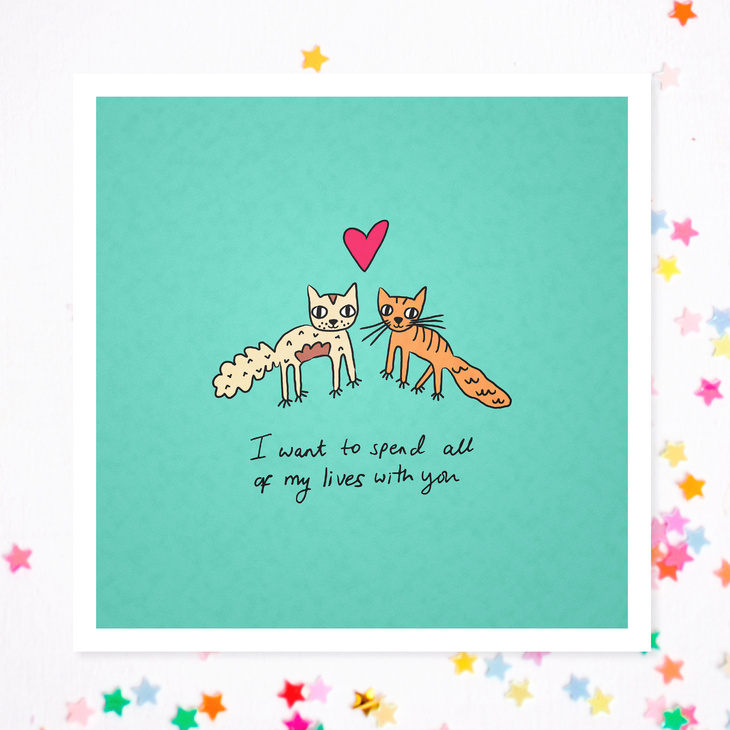 Cute doodled cats card by doodle artist Carrie Lewis. Perfect for a cat lover or for someone you are happy is in your life. Printed on to high quality matte card and with a blank inside to write your own message.