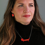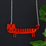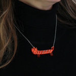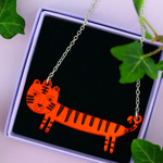If you're feeling fierce, our tiger necklace is just the thing for you. Playfully illustrated, our sausage tiger necklace (sausage because we thought it'd be fun to turn other creatures into dachshunds) is made from etched mirrored orange acrylic and hangs from a 15" silver tone chain.