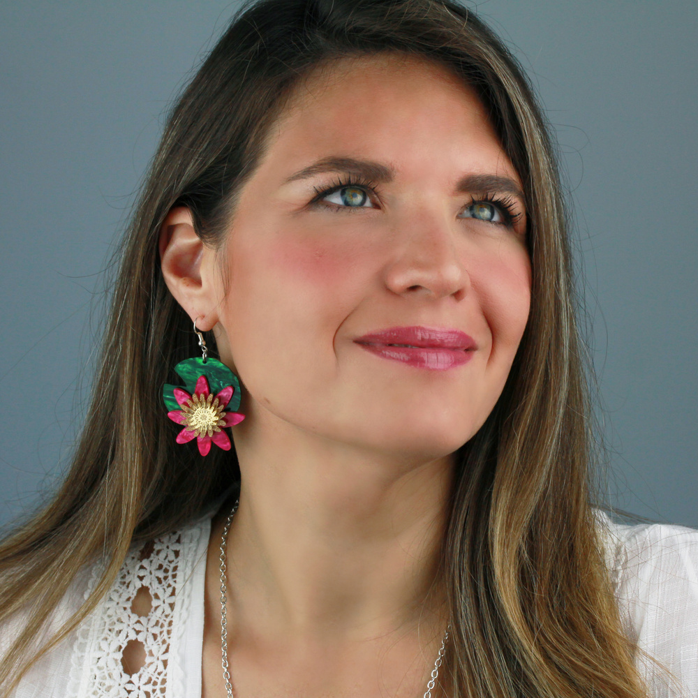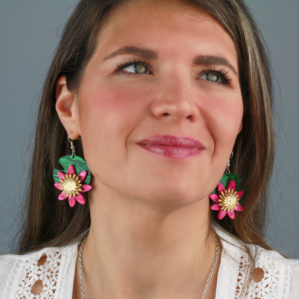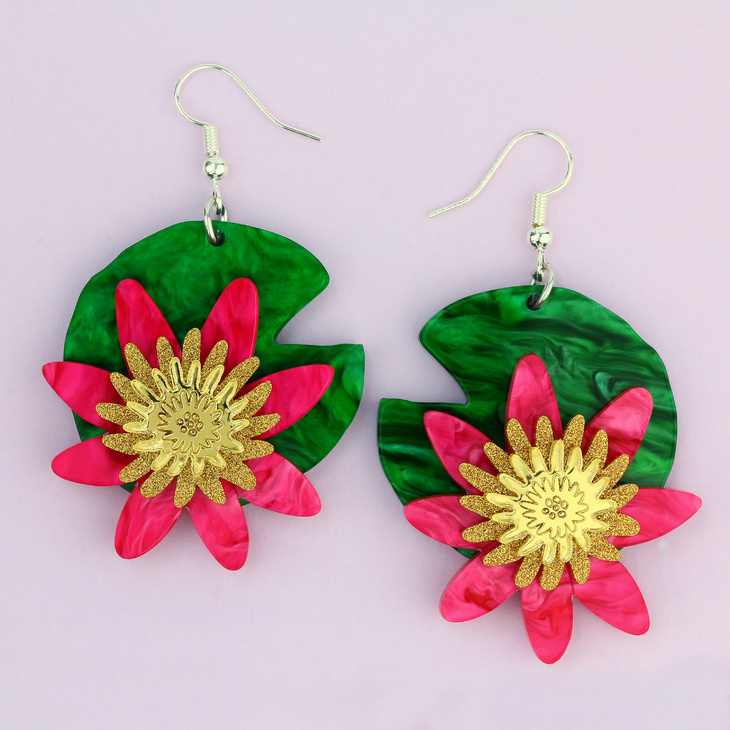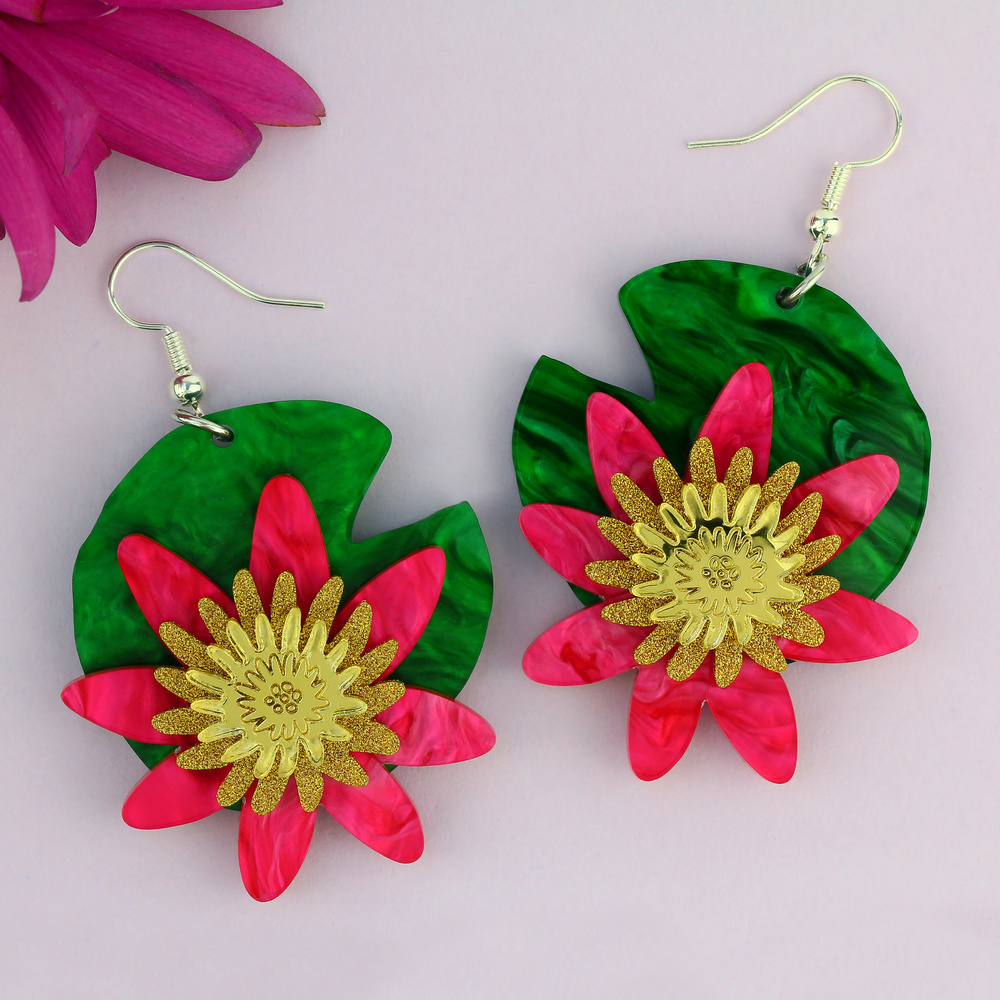 These timeless waterlily earrings are the perfect accompaniment to any outfit. Handmade in England from a gorgeous marbled pink acrylic, with bold glitter and mirrored gold centres. We use hypoallergenic stainless steel earring hooks for happy ears.