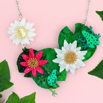 One little speckled frog, sat on a....most amazing handmade Waterlily necklace. This work of art features a pair of mirrored green frogs resting amongst their lush, colourful lily pad home. A special piece of jewellery utilising all of our experience.
