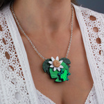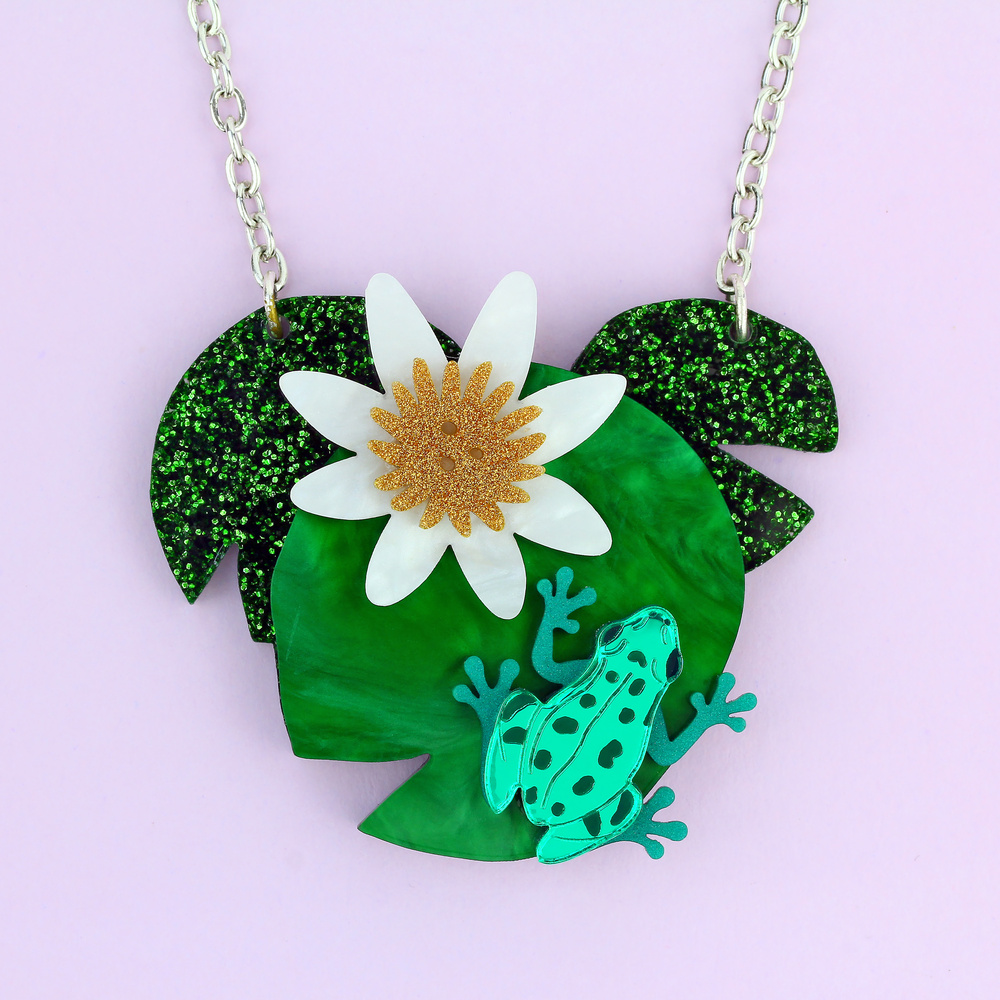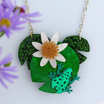 Our charming waterlily necklace features a cheery mirrored green frog sat beside a waterlily. This necklace features a host of gorgeous acrylics and hangs from a hard wearing, silver-tone chain. We are proud to hand make all of our jewellery.