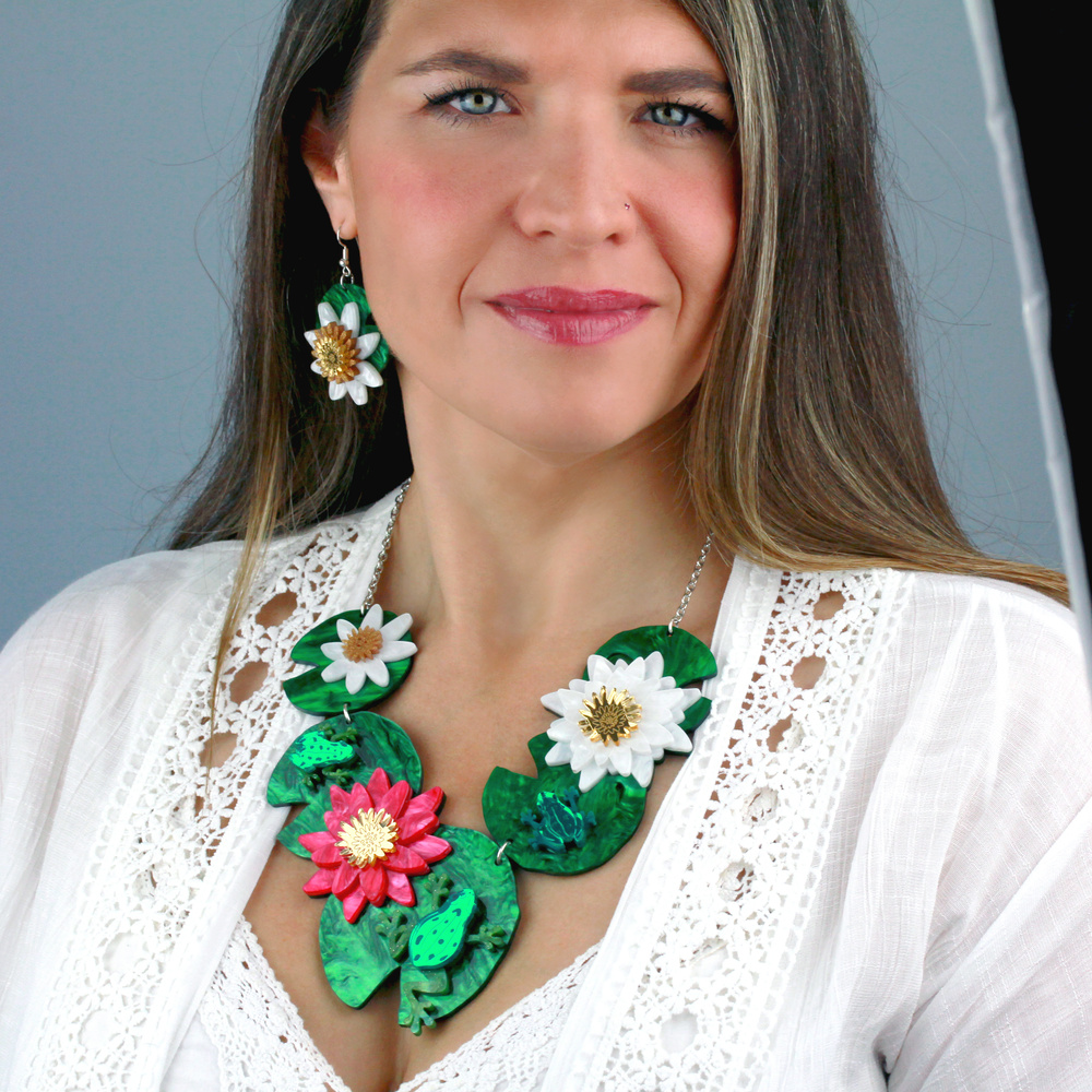 Stand out from the crowd in our eye-catching, intricately detailed Waterlily statement necklace. Featuring a composition of white and pink waterlilies and a trio of lounging frogs on lily pads. Handmade in England from gorgeous marbled and mirrored acrylic with hand-inked details. A truly amazing piece of wearable art.