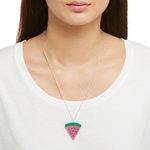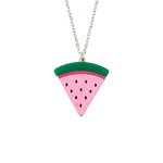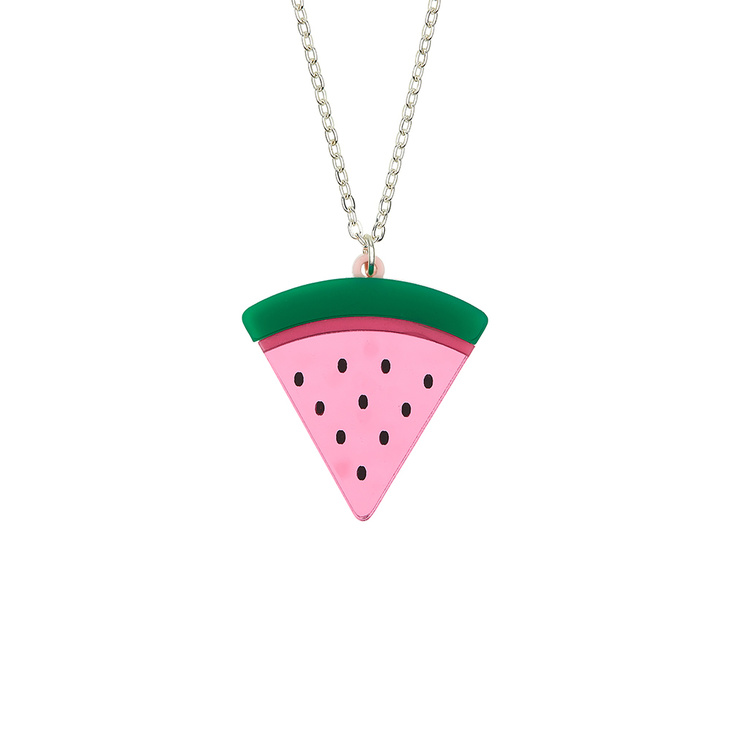 This easy-to-wear necklace has lovingly been pieced together from pieces of laser cut perspex. The watermelon seeds are individually hand inked onto sparkling mirrored pink.