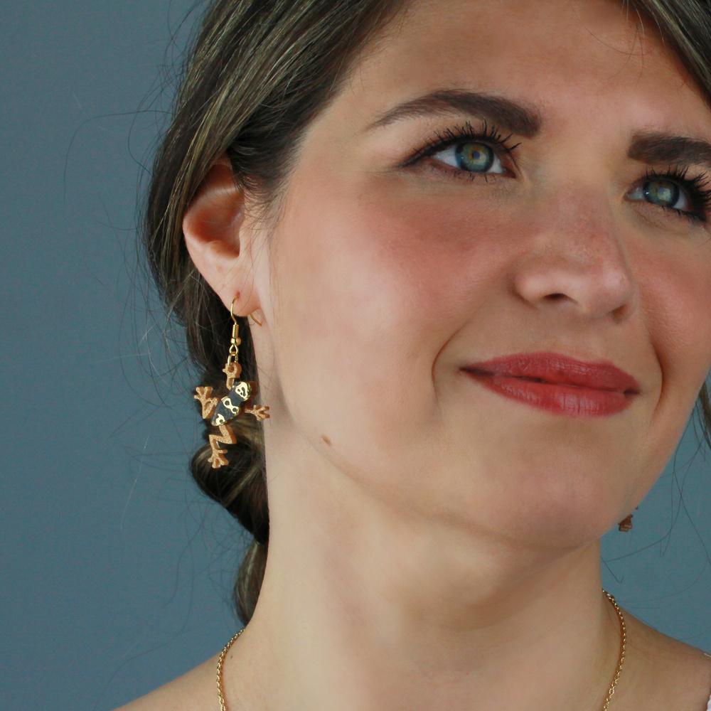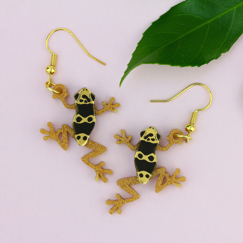 A wise woman once sang "I'm addicted to you, Don't you know that you're toxic?" and that is exactly how we hope you feel about our charming yellow banded poison-dart frog earrings. Each intoxicating froglet is 3cm long and handmade from layers of intensely glittered and mirrored gold laser cut acrylic, before being hand inked to finish. We handmake all of our jewellery in the South of England.